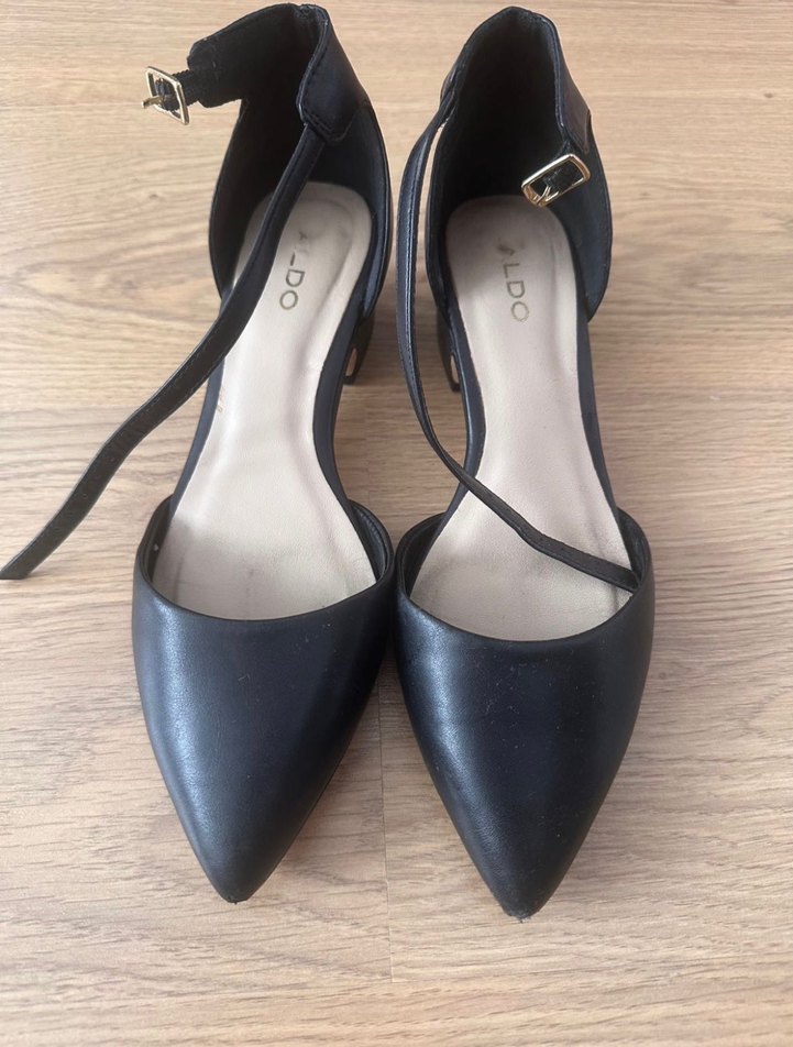 Kadınlar için siyah tokalı stiletto topuklu ayakkabı. Minimalist ve gotik tarzda, romantik akşamlar için uygun. Marka: ALDO.