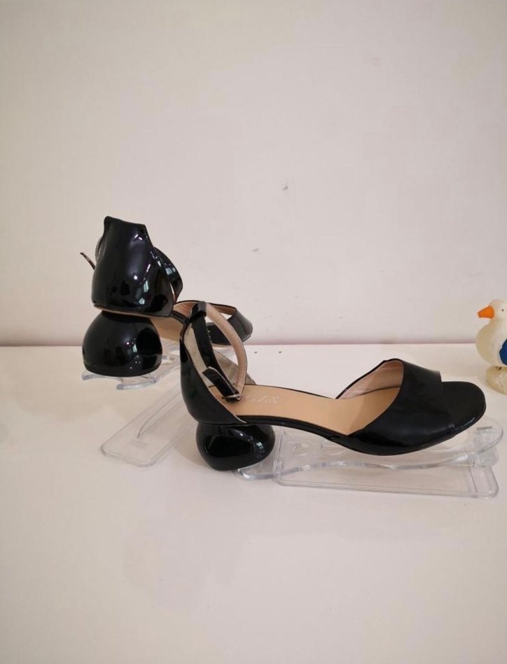Kadın siyah tokalı, yuvarlak blok topuklu ayakkabılar. Kauçuk malzemeden üretilmiş, ofis için uygun, çağdaş ve avangart tarzda. #ayakkabı #kadın