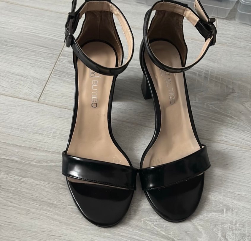 Butico markalı siyah blok topuklu sandaletler, tokalı bilek bantlı, minimalist ve cesur gotik tarzda, ofis kullanımı için uygun.