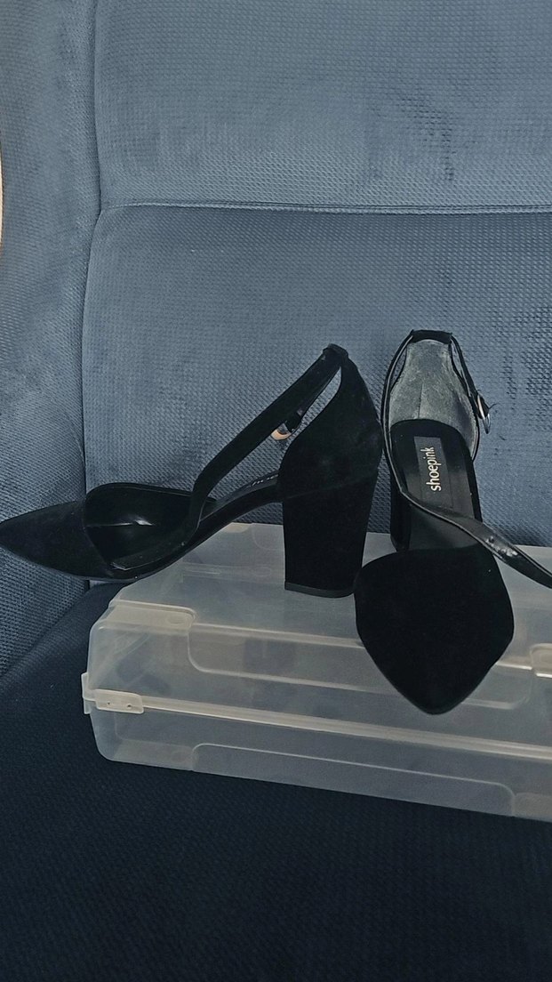 Siyah renkli, tokalı, blok topuklu kadın gece ayakkabısı. Minimalist ve cesur goth tasarıma sahip, romantik akşamlar için uygun. Giyilmedi