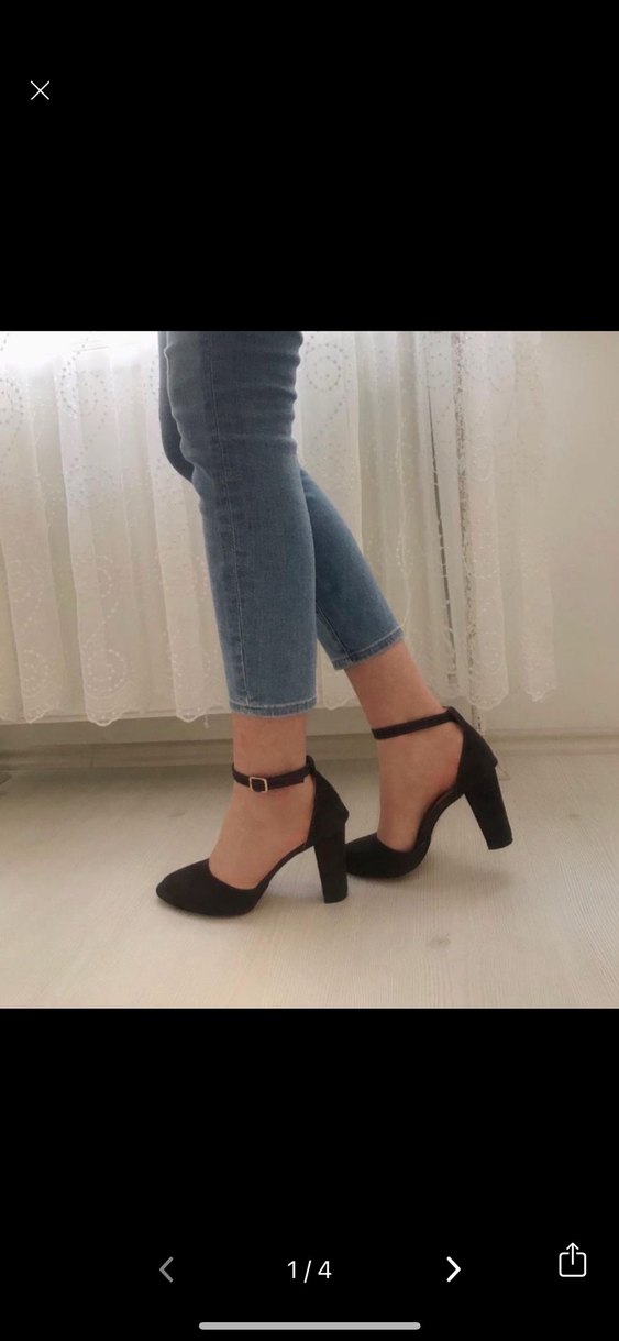 Siyah topuklu, kemerli ve denim malzemeden yapılmış kadın ayakkabısı. Günlük kullanım ve sokak stiline uygun rahat tasarım. Birkaç kere kullandım