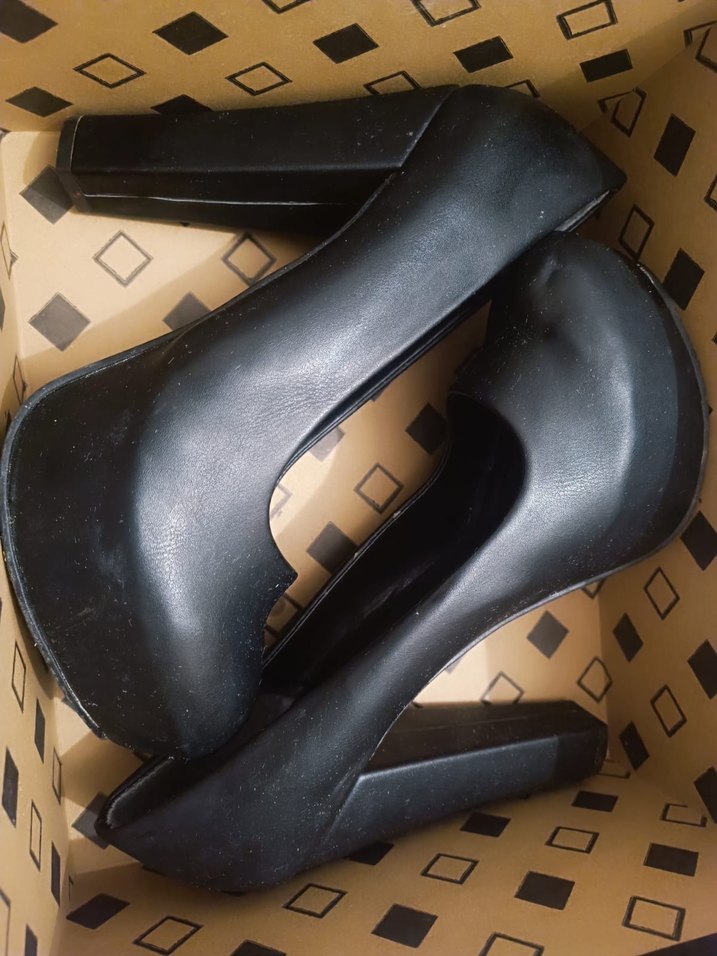 Kadın siyah stilettolar, kalın topuklu ve tokalı, kauçuk malzemeden. Ofis için uygun, gotik tarzda cesur tasarım.
