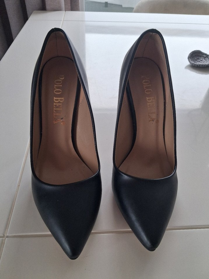 Siyah, tokalı ve lastik malzemeden yapılmış stiletto topuklu ayakkabılar. Cesur, gotik tarzı yansıtan ve ofis kullanımı için uygun. İç kısmında "OLOBELLA" yazısı bulunur.