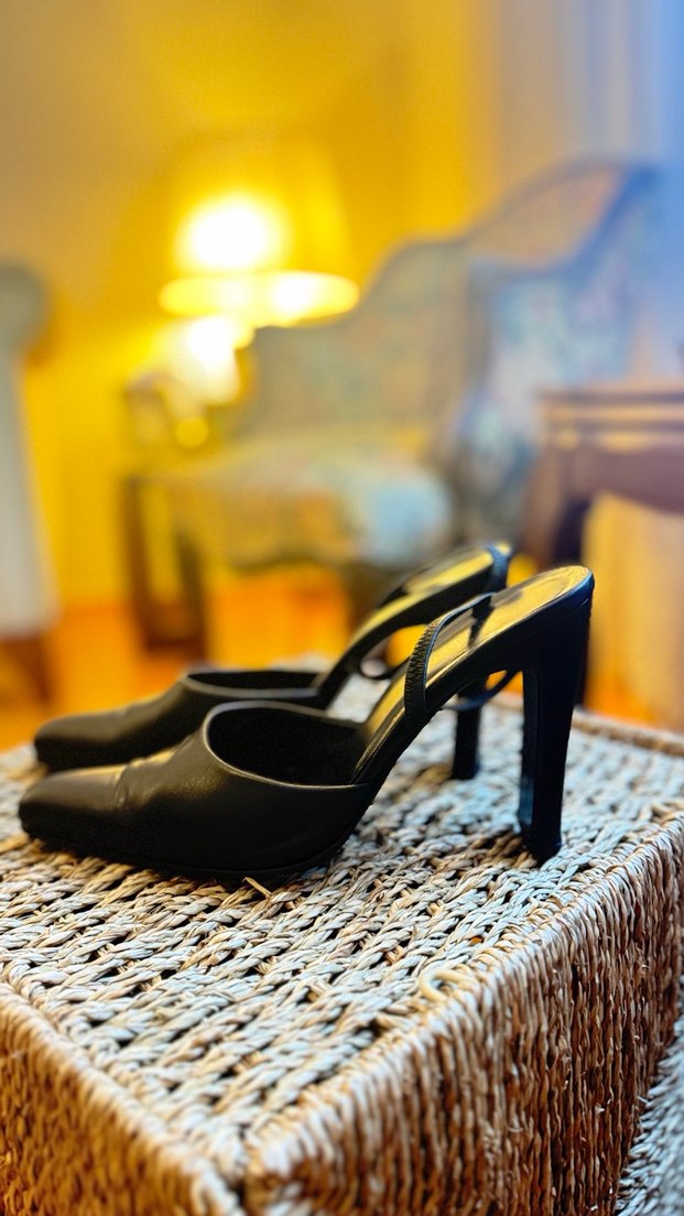 Kadınlar için tokalı siyah stiletto, kauçuk malzemeden. Ofis kullanımı için uygun, desensiz ve gotik tarzda.