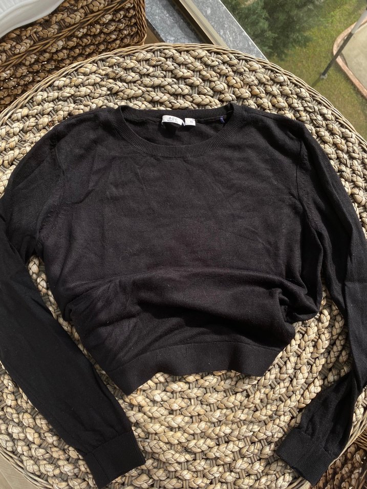 Siyah renkte, uzun kollu, yuvarlak yaka ve örgü dokulu keten kumaştan salaş kesim triko. Günlük rahat kullanıma uygundur.
