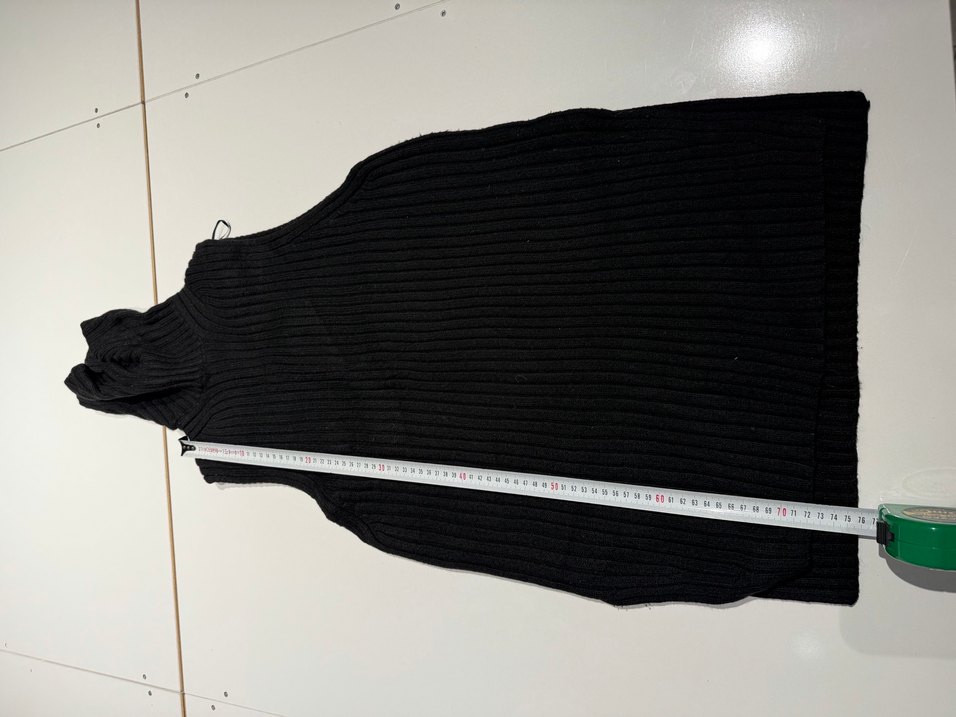 Örgü dokulu, boğazlı ve kolsuz, vücuda oturan siyah kadın süveter. Yumuşak sentetik kumaştan, midi boyda ve gündelik kullanıma uygun.