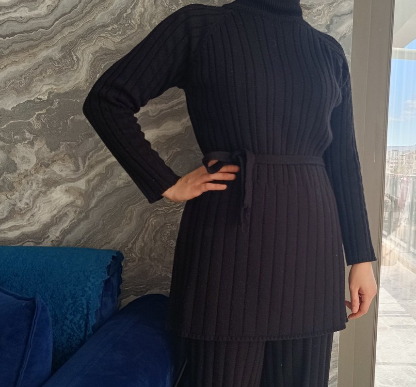Siyah triko kumaştan, boğazlı ve uzun kollu, pilili detaylı, rahat kesim kadın takım. Günlük kullanıma uygundur.