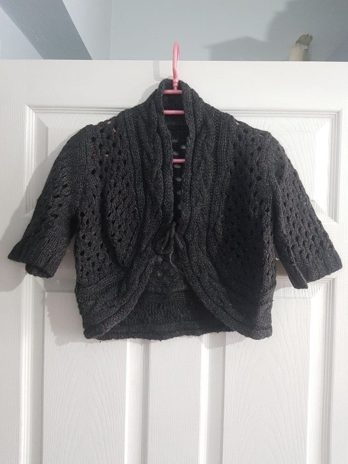 Kadin için siyah, örgü triko bolero. Oturan kesim, yakasında kesik detay ve askılı kollarla gotik tarzda.