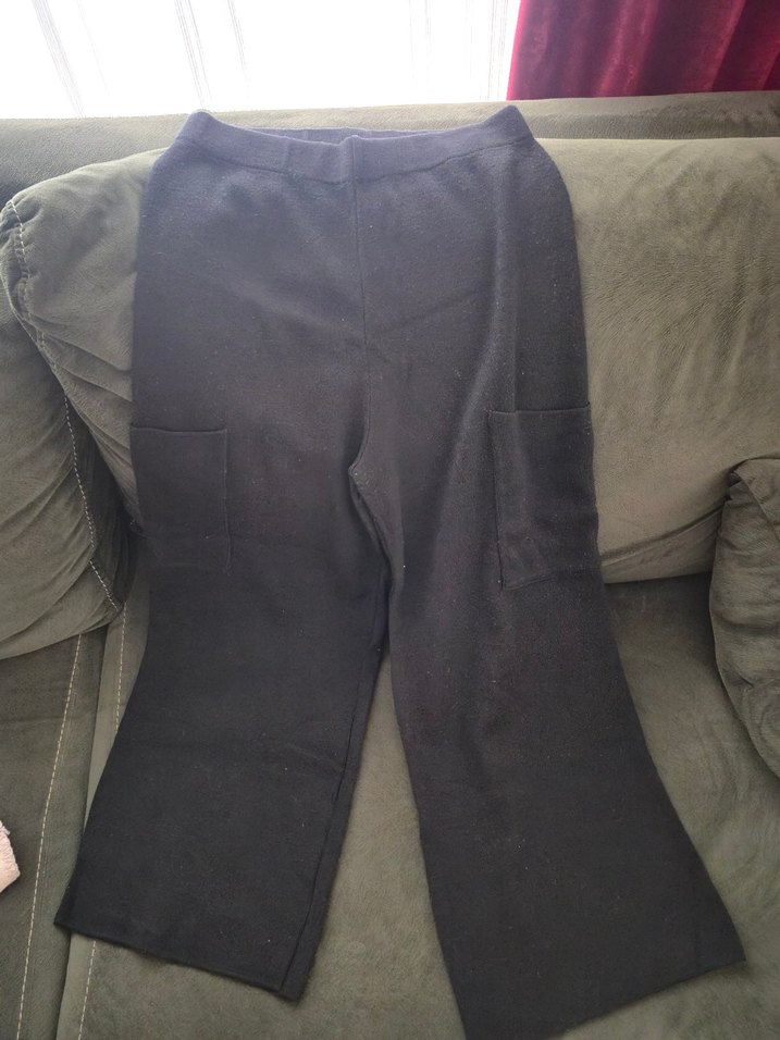 Kadınlar için sentetik kumaştan, Velcro detaylı, siyah, normcore tarzda, midi boy, bol kesim triko pantolon. boyu bilek üstüdür, hafif pürüzlendi