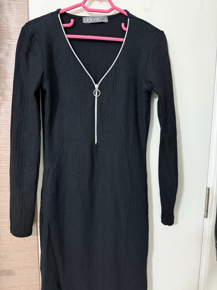 Siyah triko kumaştan, uzun kollu ve V yakalı, fermuarlı detaylı, fitted kesim elbise. Minimalist ve günlük sokak stili için uygundur.