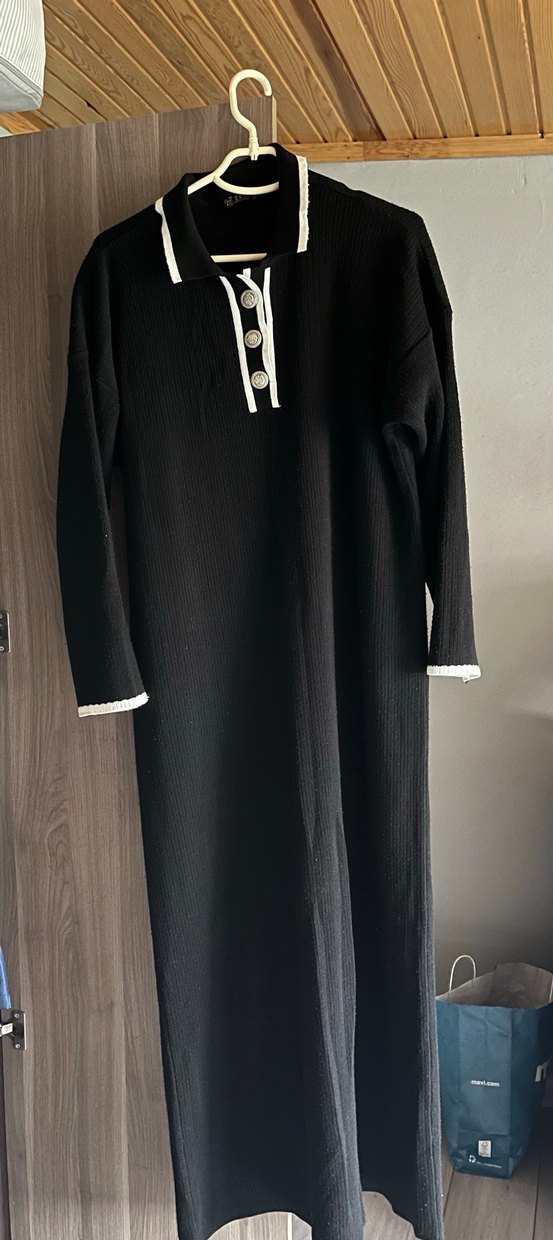 Siyah renkte, yakalı ve uzun kollu triko elbise. Yumuşak sentetik örme kumaştan,günlük kullanım için uygundur. Elbisede tiftiklenme oluştu o sebeple uyguna koydum