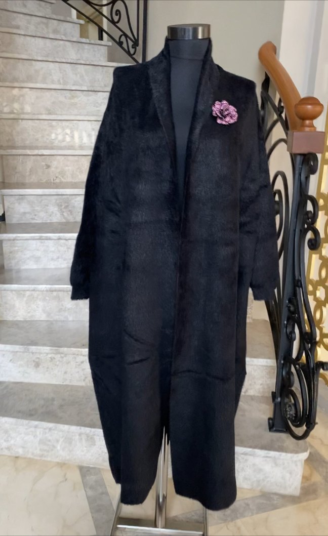 Kadın siyah uzun hırka broş detaylı ve kesik yaka. Yumuşak ve sıcak dokulu, uzun kollu, rahat kesim goth tarzında.