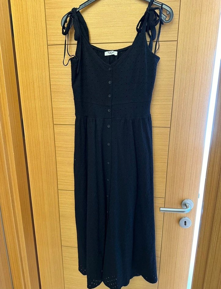Siyah uzun elbise, bağlamalı askılar ve düğmeli ön detaylara sahiptir. Rahat kesimli ve yumuşak sentetik kumaştan üretilmiştir, günlük kullanıma uygundur. alt tarafında çamaşır lekesi var cok ufak belli olmuyor yakından bakınca belli olur sadece.