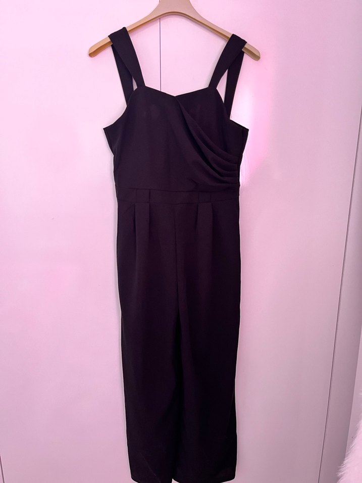 Siyah uzun tulum, straplez yaka ve geniş askılarla. Gövde kısmında drapeli detay bulunur. Rahat kesimli, sentetik kumaştan, romantik akşamlar için uygundur.