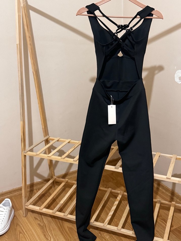 Kadınlar için siyah, uzun ve askılı tulum. Halter yaka ve sırt detaylarıyla, kemerli ve sentetik yumuşak kumaştan üretilmiştir. Günlük kullanım için uygundur.