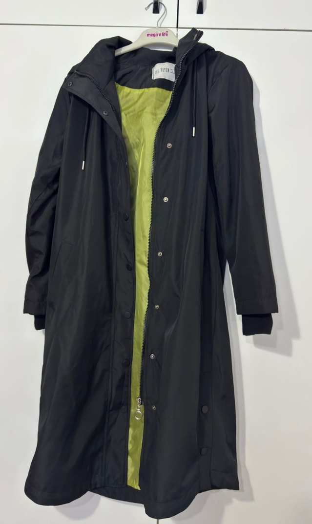 Kadın siyah uzun trenç, düğmeli, uzun kolludur ve günlük dış giyime uygundur.