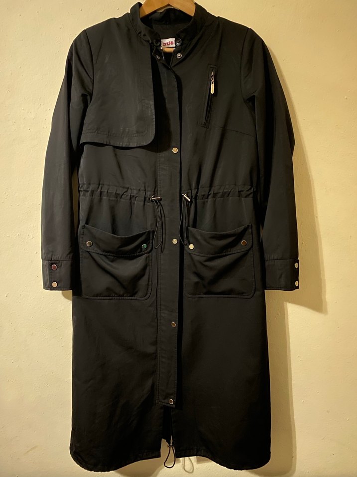 Kadın siyah uzun bel biyeli parka kesik yaka ve uzun kollu tasarım bulunur. Yumuşak fleece kumaştan üretilmiş, günlük sokak stili için uygundur. En 45 boy 105 cm