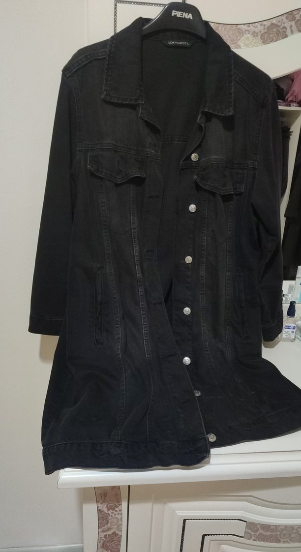 Kadınlar için siyah renkli, uzun ve bol kesim denim ceket. Düğmeli, uzun kollu ve yakası kesik detaylı, günlük sokak stili için uygun. çok tarz sıfır