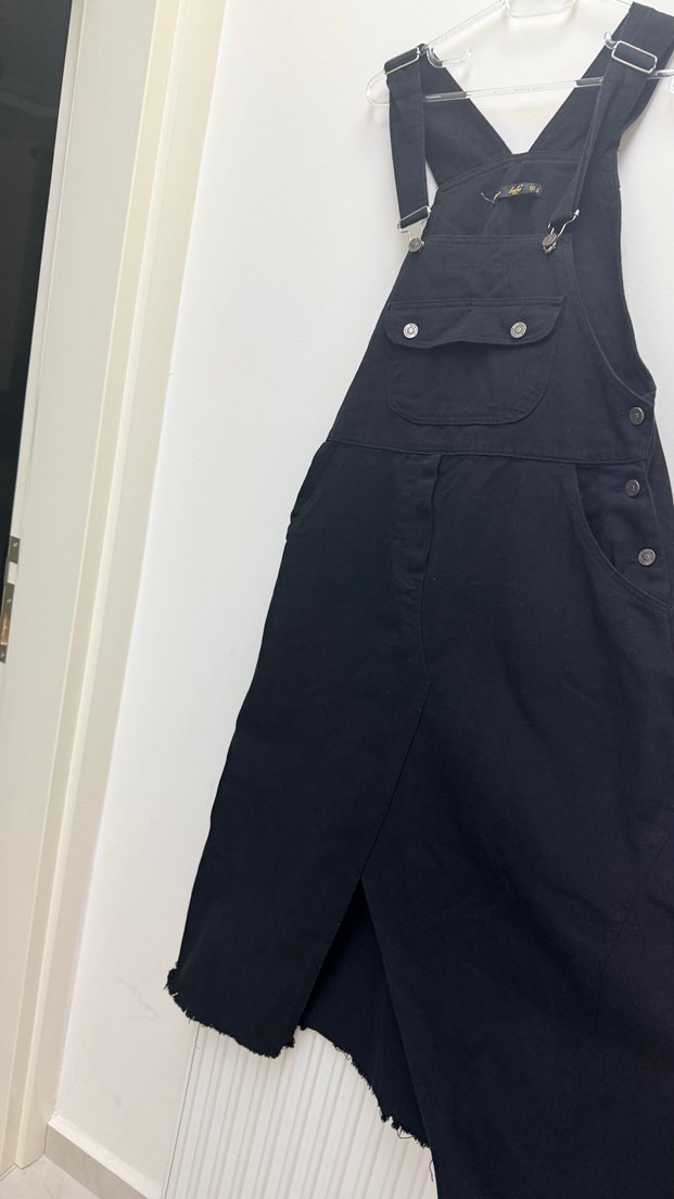 Siyah uzun kesim, yüksek yakalı ve bol kesim kadın denim tulum. Kemer detaylı ve askılı, sokak stili için uygun. Desensiz, günlük kullanıma uygun.