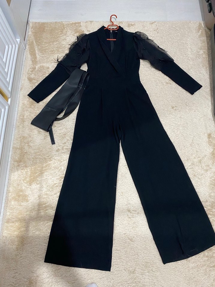 Kadın siyah uzun kemerli tulum, yakası kesik ve askılı uzun kollu. Sentetik kumaştan, regular fit ve kemerli, iş ve sokak stili için uygun.