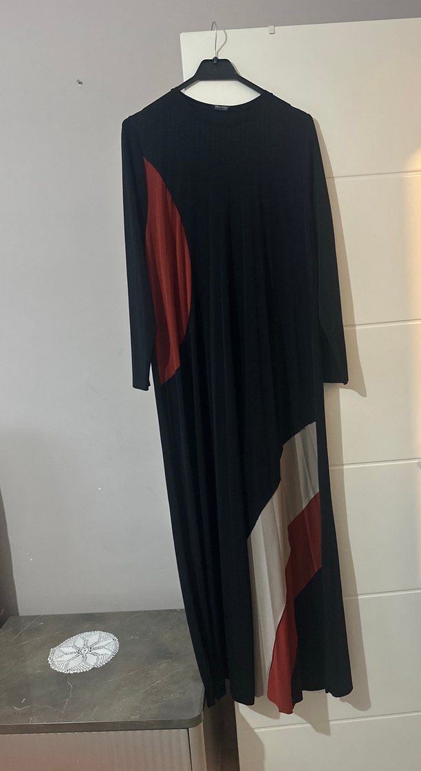 Kadınlar için uzun, dökümlü ve bol kesim elbise. Siyah renkte, sentetik yumuşak kumaştan, bisiklet yaka ve askılı kollu, modern renk blok detaylarıyla.
