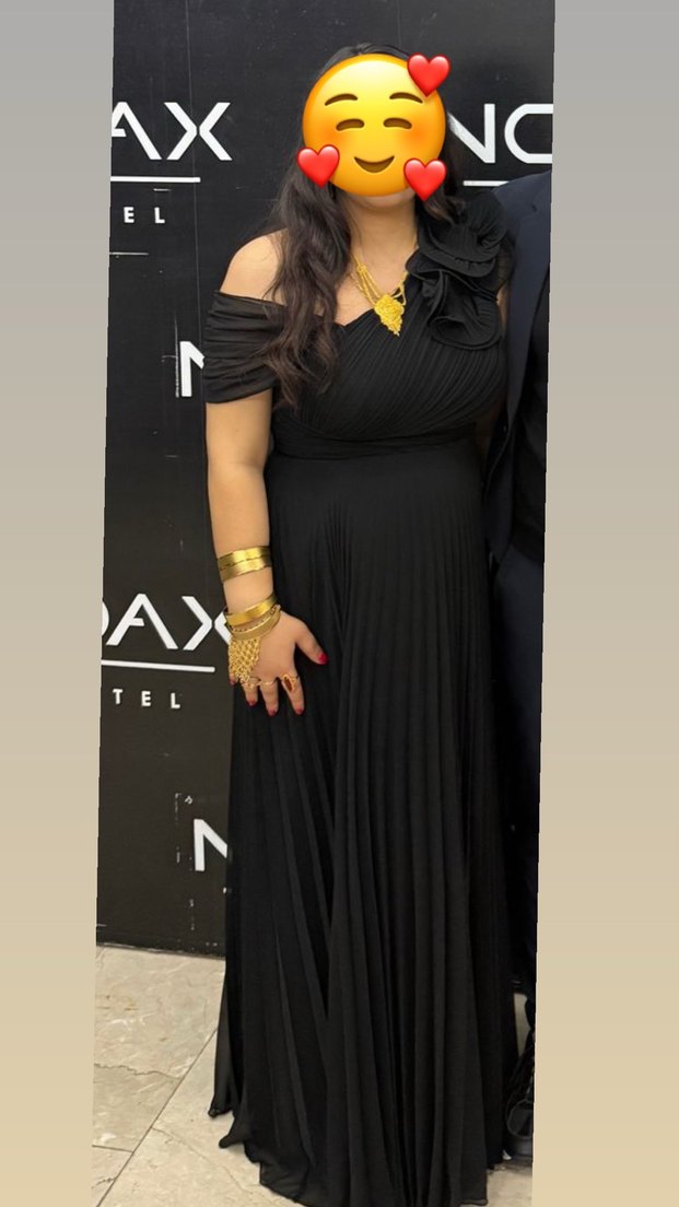 Siyah uzun abiye elbise, drapeli ve vücuda oturan kesimiyle dikkat çeker. Kayık yaka ve ince askılı kollara sahiptir, desenli dokusuyla cesur ve göz alıcıdır.