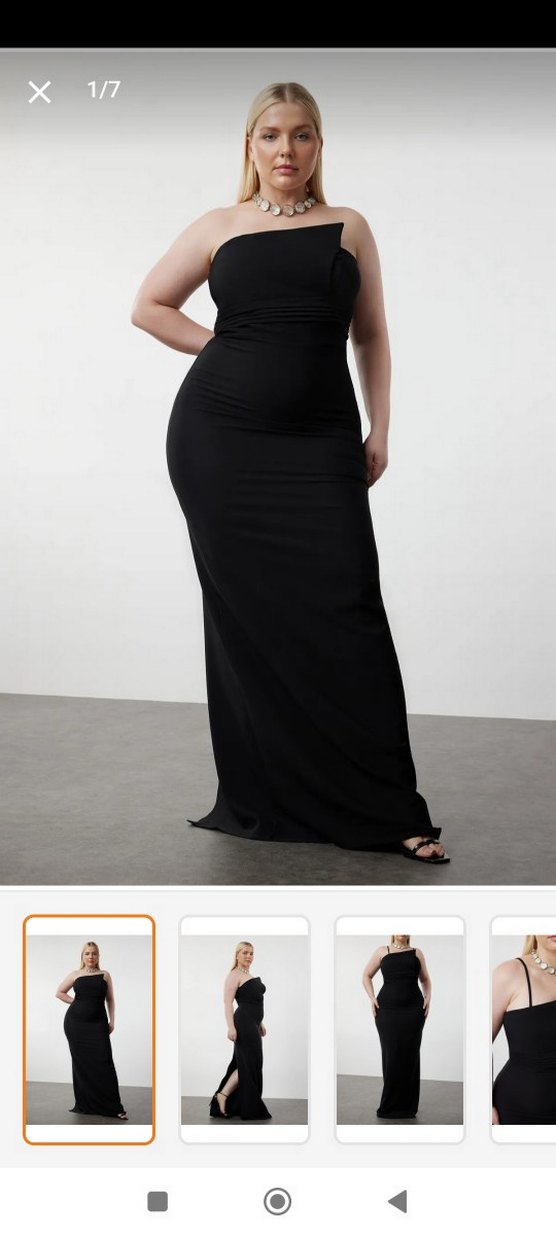 Siyah, drapeli, uzun ve vücuda oturan elbise, kayık yaka ve ince askılarla, pürüzsüz sentetik kumaştan, düğünler için uygun. likralı üründür 175 boy 80 kilo ile giydim ben askı yaptirdim