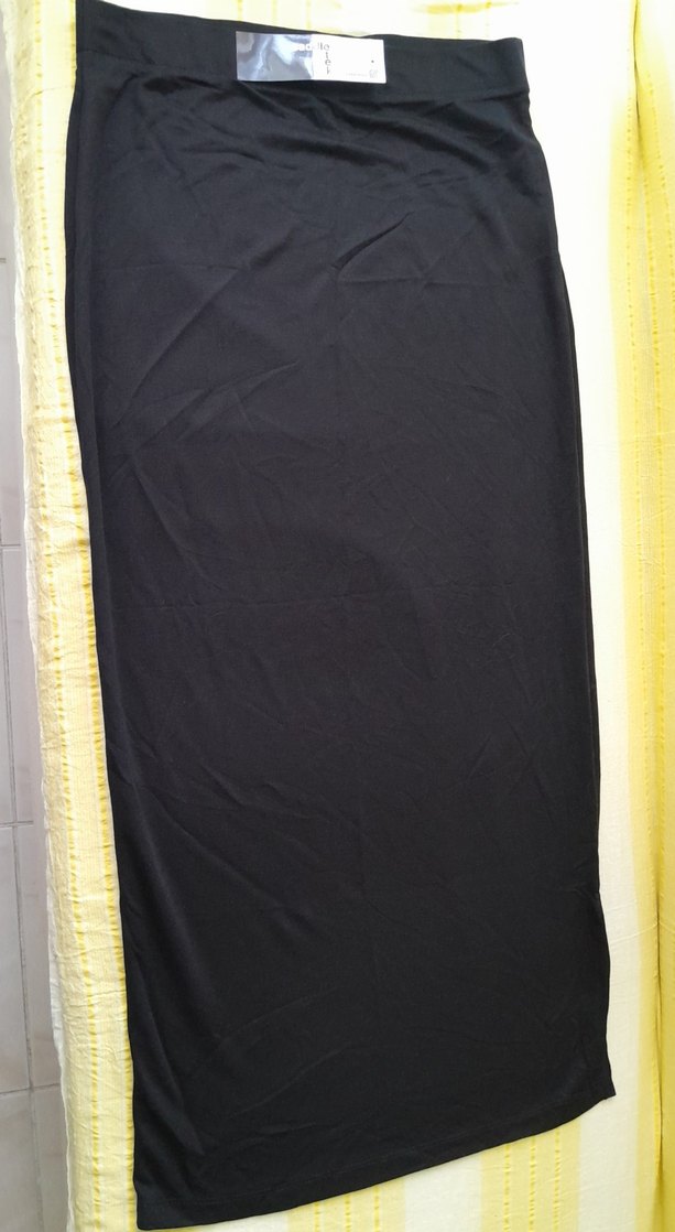 Kadınlar için tasarlanmış, drapeli detaylara sahip, siyah renkte ve sentetik kumaştan yapılmış uzun, vücuda oturan etek. Bel.36cm.boy 90cm.