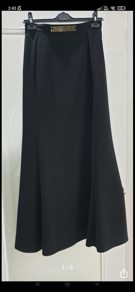 Siyah uzun drapeli etek, rahat kesimli ve sentetik kumaştan üretilmiştir. Kumaş kalitesini çok çok iyi hafif kuyruklu balık şeklindedir özel günler ve düğünlerde giyilebilir ve klasik şıklık sunar beden XL yazıyor fakat m bedene daha uygundur