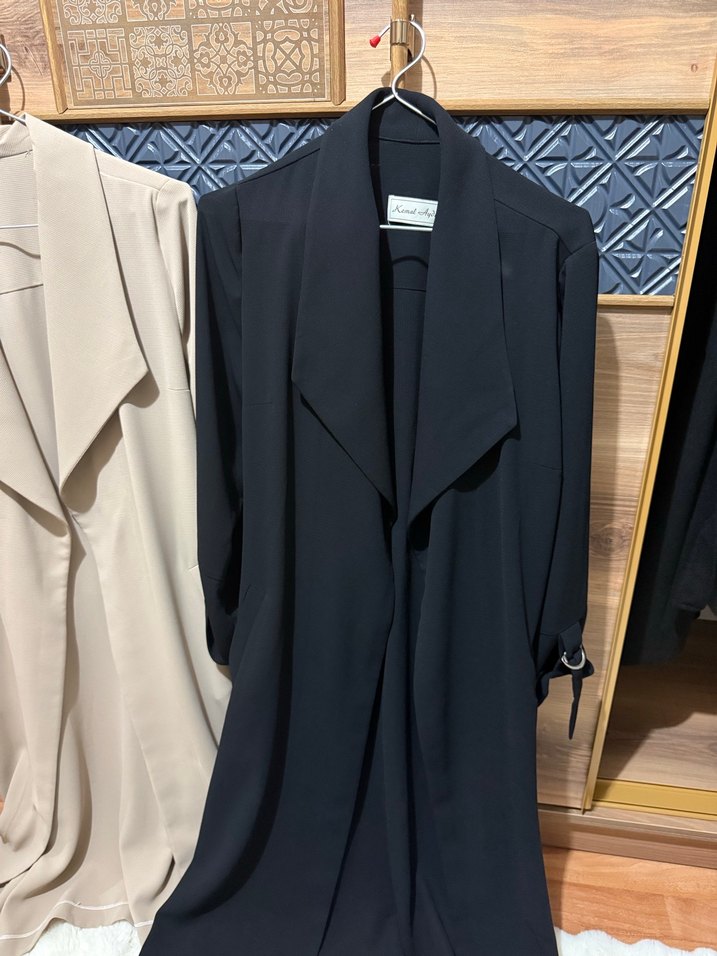 Kadın siyah uzun kaban, yakası kesik ve drapeli tasarıma sahip, ipeksi kumaştan, uzun kollu, modern ofis şıklığı sunar. Kemal aydın mağaza ürünü
