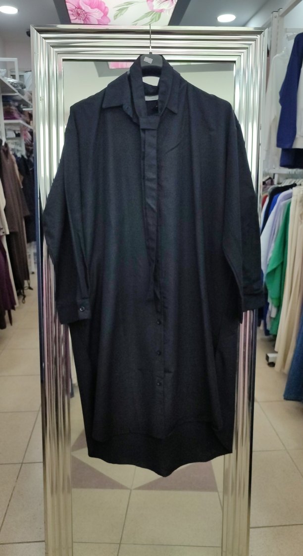 Kadın siyah uzun gömlek, düğmeli ve notalı yaka detayına sahiptir. Düz ve sade tasarımlı ürünlerimiz mağaza ürünüdür kuşaklı