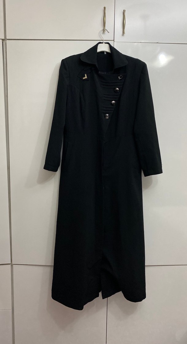 Saten dokulu, uzun siyah kadın kaban, kesik yaka ve düğmeli ön detaylıdır. Uzun kollu ve regular fit kesimle gotik tarz sunar.