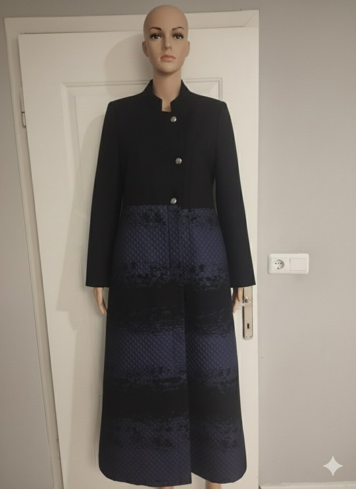 Kadınlar için uzun siyah kaban, notlu yaka ve düğmeli kapama ile. Sentetik kumaş üzerine koyu tonlarda batik desen bulunur. Ofis için klasik ve gotik tarzda, regular kesim ve uzun kolludur.