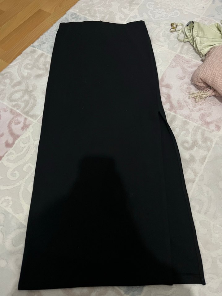 Siyah, dar kesim uzun etek, yırtmaç detayıyla sade ve minimal goth tarzında, sentetik kumaştan üretilmiştir.