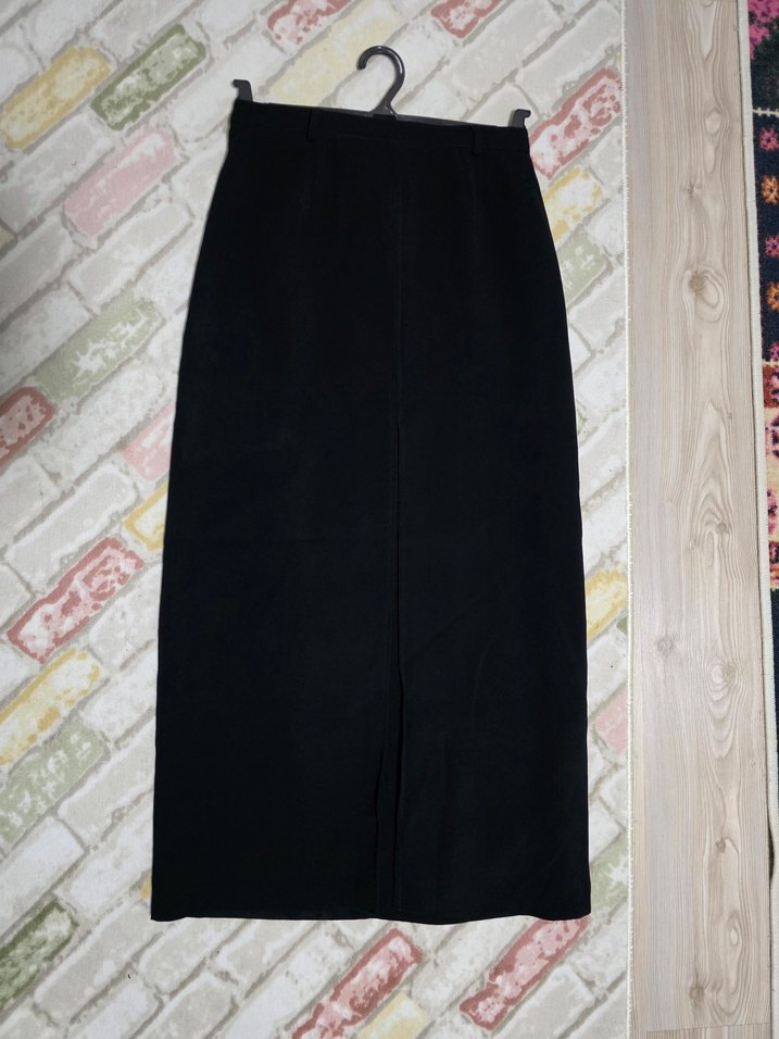 Siyah renkli uzun etek, ön kısmında kapalı yırtmaç detayı bulunmakta olup içi astarlıdır. Etiket üzerinde beden 38 yazmaktadır; ancak mezura ile yapılan ölçüme göre yarım bel ölçüsü 35 cm, etek boyu 94 cm’dir. Az kullanılmıştır. Tesettürlü bayanlar için daha idealdir.
