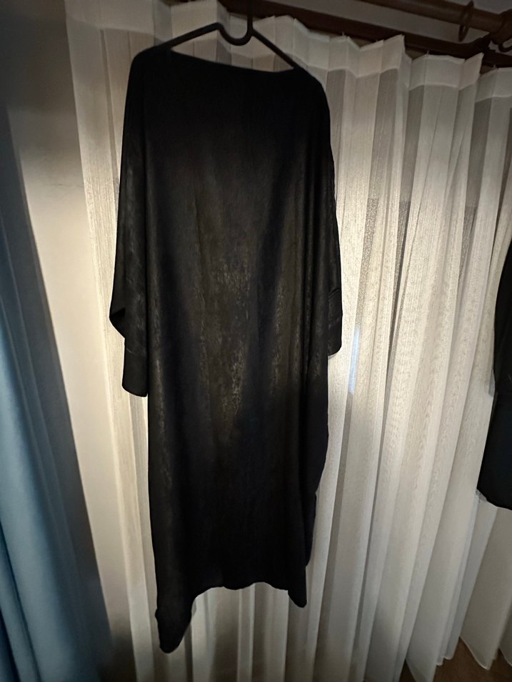 Siyah uzun keten elbise, drapeli, kayık yaka ve uzun kolludur. Gevşek kesim ve gotik tarzda günlük kullanıma uygundur.