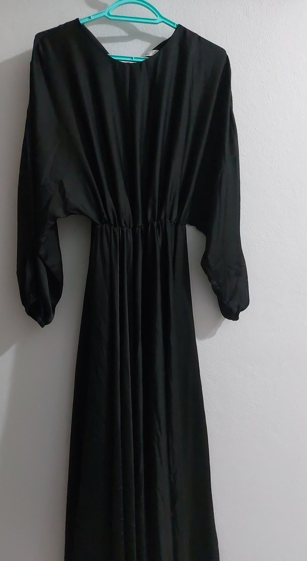 Siyah uzun elbise, İpek gibi kumaştan, dökümlü tarzda.