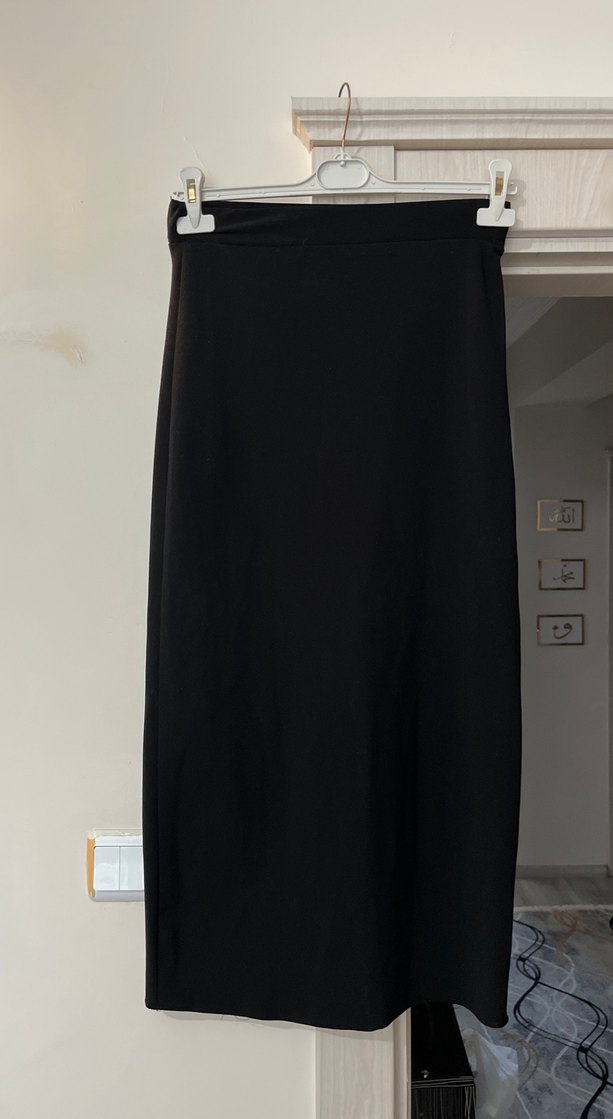 Siyah renkli, sentetik kumaştan yapılmış, regular fit uzun etek. Minimalist ve normcore tarzıyla ofis için uygun, zahmetsiz şıklık sunar.
