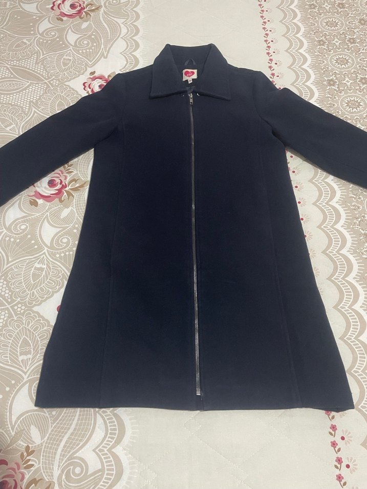 Kadınlar için uzun kesim, fermuarlı, yakası kesik ve uzun kollu siyah kaban. Yumuşak ve sıcak kumaştan, klasik günlük kullanım için uygun.