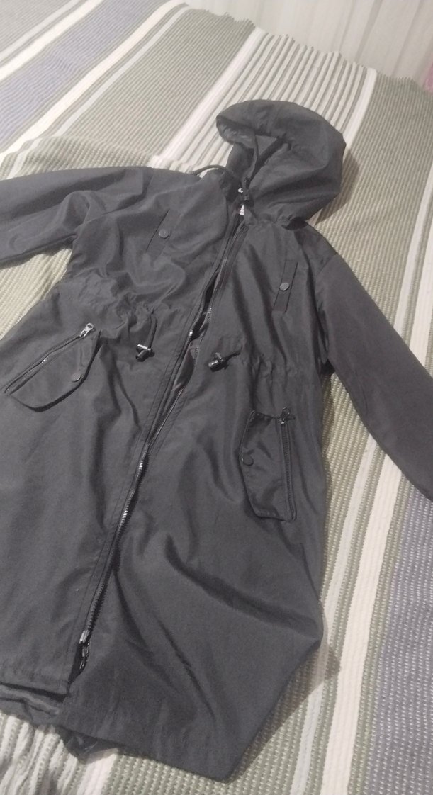 Kadın siyah uzun mont, fermuarlı cepler ve kapüşonlu. Sentetik kumaştan, dar kesim, yakası kesimli, uzun kollu, sokak stiline uygun.