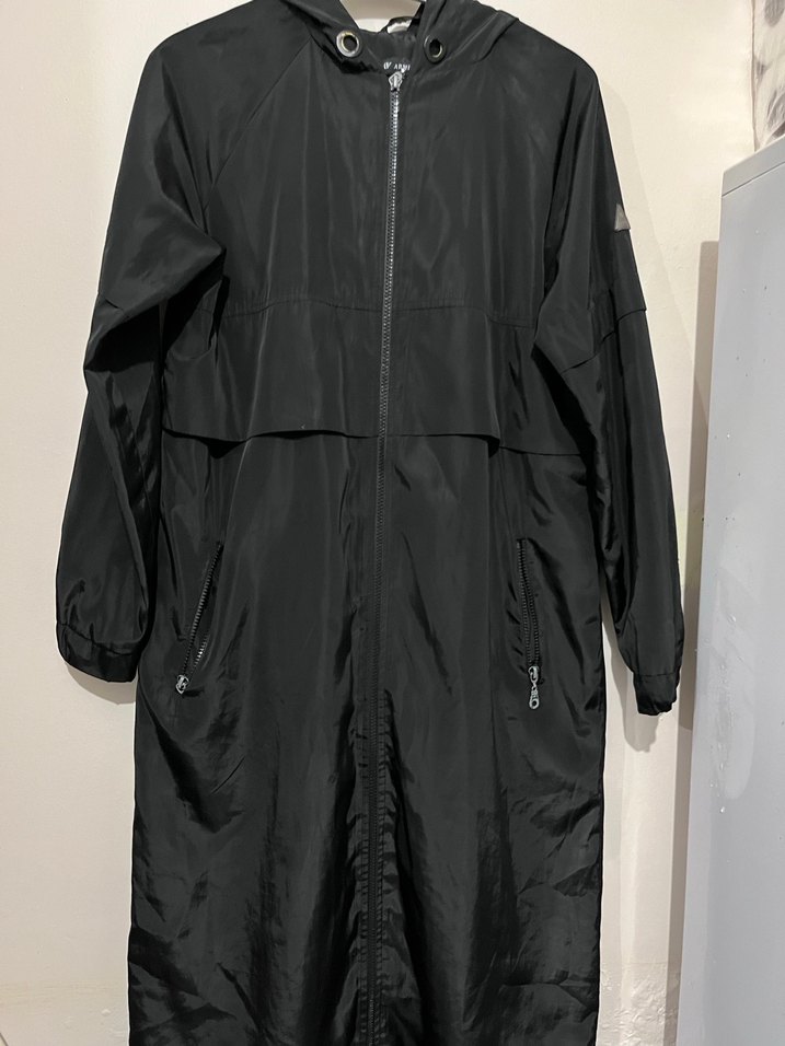 Kadın siyah uzun fermuarlı yağmurluk, sentetik kumaştan, bol kesim ve uzun kolludur. Notlu yaka detayıyla dış mekan sokak modasına uygundur. ️