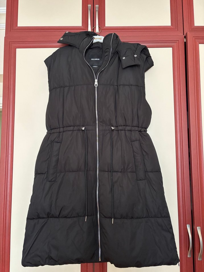 Siyah renkli, uzun boylu, fermuarlı ve yüksek yakalı kadın yeleği. Sentetik kumaştan, fit kesim ve rahat sokak stili için uygun. Hiç kullanılmadı.