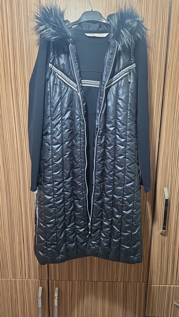 Siyah, uzun ve fermuarlı kolsuz yelek, sentetik kumaştan yapılmıştır. Regular fit ve straplez yakaya sahiptir, günlük ve sokak modası için uygundur.Yeleğin takimi içerisinde kısa sportif tuniğide mevcuttur.