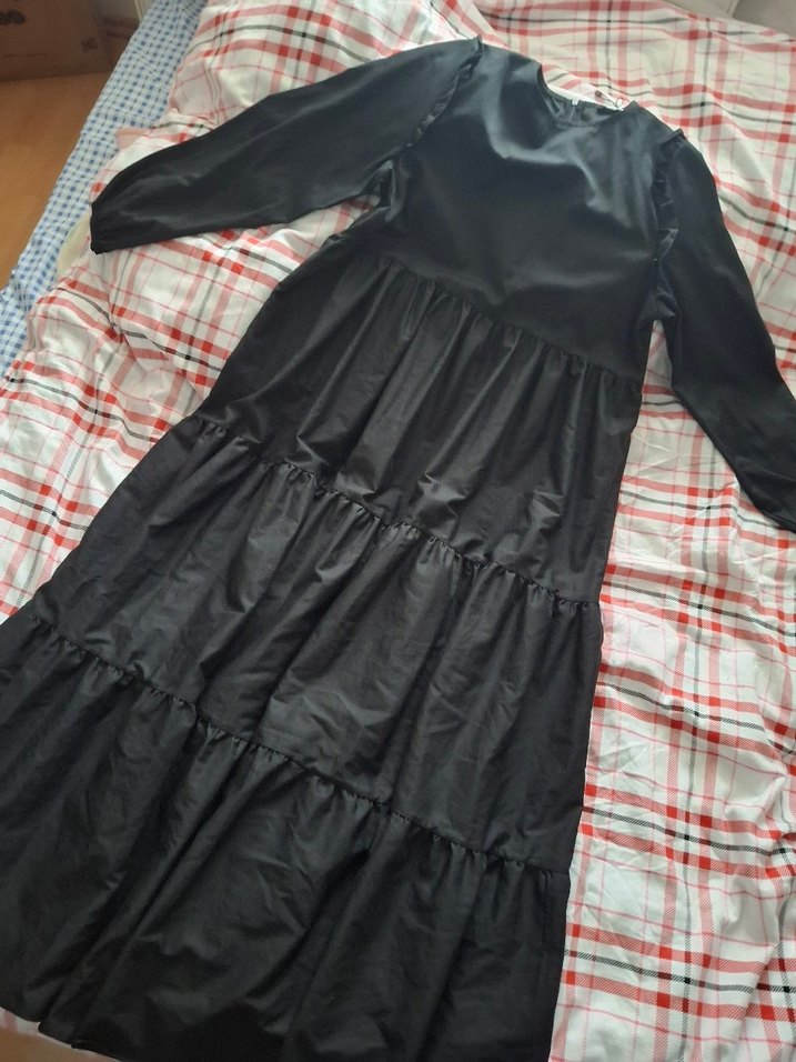 Kadın siyah uzun elbise, yüksek yakalı ve uzun kollu, bol kesimdir. Katlı fırfır detaylarıyla gotik tarzda, sentetik kumaştan üretilmiştir.