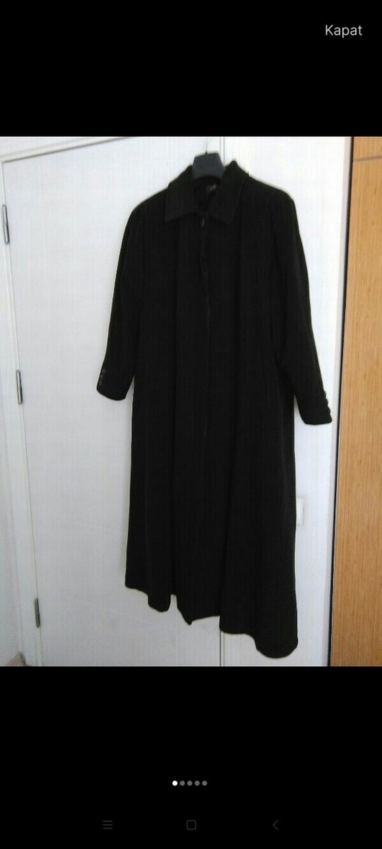 Kadınlar için siyah uzun kaban, bol kesim ve yakalıdır. Pileli detayları ve uzun kolları ile ofis için uygundur, gotik tarzda şık bir parça. boyu 134 iki kol arası 70 kol boyu 60 cm