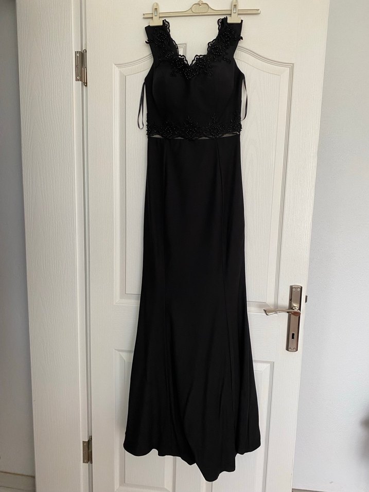 Dantel detaylı V yakalı, askılı ve drapeli, klasik şıklıkta siyah uzun fitted balık abiye düşük omuzlu elbise. Düğün için uygun. 165 boy 45-50 kg arası uygun