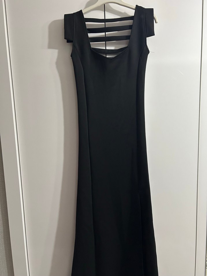 Siyah uzun elbise, ince askılı ve tekne yaka detayına sahip. Sentetik kumaştan üretilmiş, yırtmaçlı.Boyuna dokunmadım uzun boyluysanız size de olur. Kısa boyluysanız kestirmeniz gerekebilir. Defosu yok S-M UYUMLUDUR. Esneyen kumaştır.