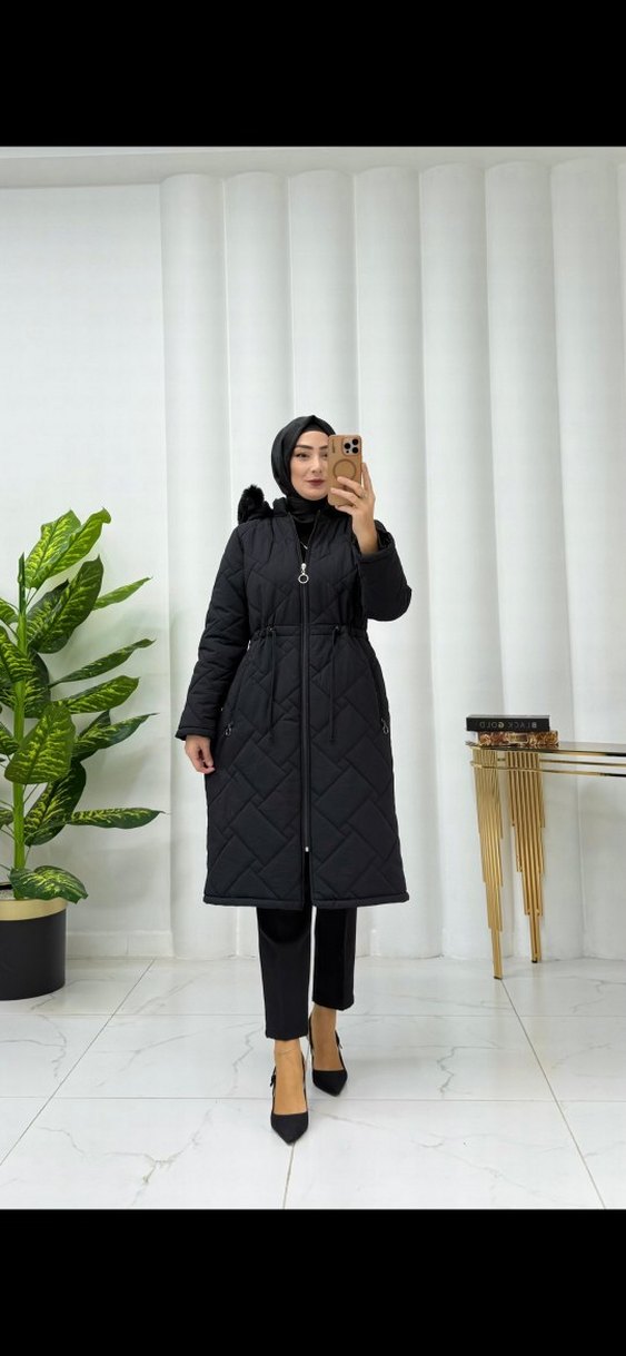 Kadın siyah uzun kışlık kaban, yakasında kürklü detay ve uzun kolludur. Rahat kalıbı ve kapitone deseniyle günlük kullanıma uygundur.