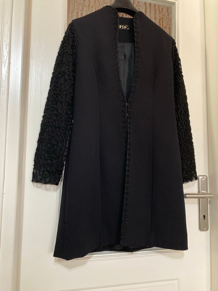 Uzun siyah kadın kaban, kürklü detaylı kollar ve kesik yaka ile gotik tarzda, ofis için uygun, regular fit.