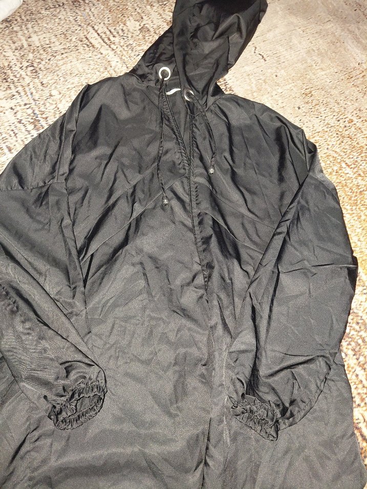 Siyah uzun kapüşonlu yağmurluk, fermuarlı ön kısmı ve bol kesimiyle, sentetik kumaştan üretilmiş, uzun kollu ve sokak stili için uygun. ️